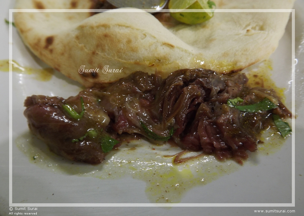 If you can reach early, it wont be an issue, but once the rush starts, getting a seat is difficult. Looking for someone who is nearly done with his breakfast and standing beside him is the common practice here. Once you get the seat, (each table seats four to six and you will have to share it with strangers) order a plate of Nihari and puris or tandoori rotis to accompany it. Puris are the favourites during breakfast, but I personally prefer the tandoori rotis. I think the rotis here are one of the best in Calcutta and far better than what most of the big restaurants serve. Soft, fluffy and not dry they are just perfect to go with the spicy yet smooth Nihari.