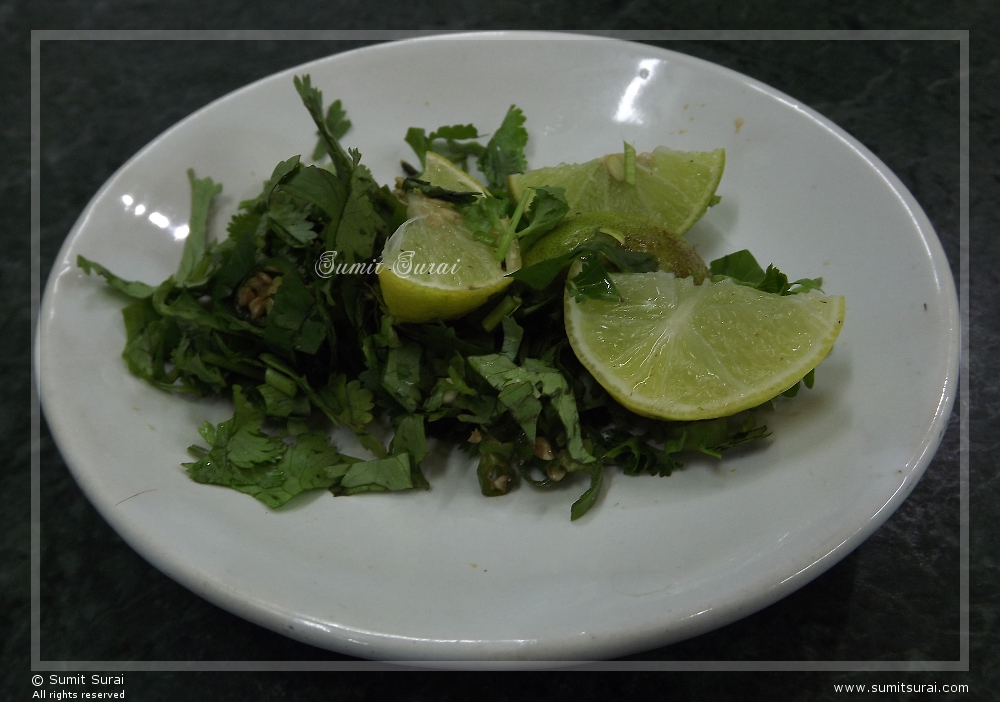 Lemon wedges and chopped coriander, chillies